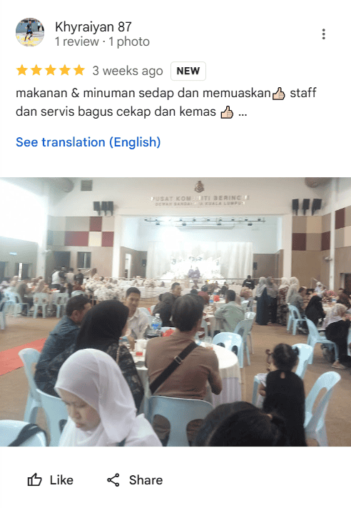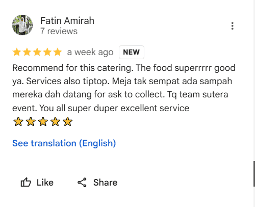 β€œRecommend for this catering. The food superrrrr good ya. Services also tiptop. Meja tak sempat ada sampah mereka dah datang for ask to collect. TQ team sutera event. You all super duper excellent service, ⭐⭐⭐⭐⭐